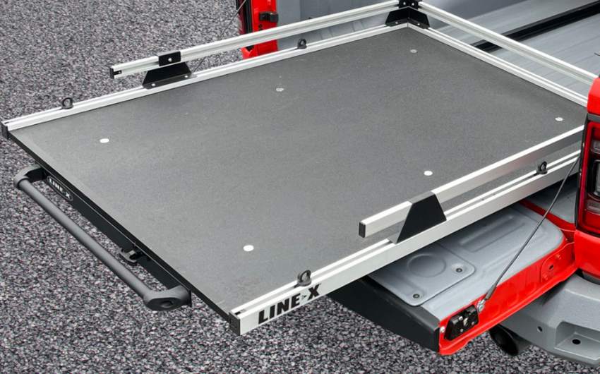 If you’re tired of crawling around the bed of your truck to access your cargo, the LINE-X Sliding Cargo Deck is your answer. This deck extends up to 70% out the back of your bed allowing access to your tools, equipment, gear, or any other cargo from beside the tailgate.
